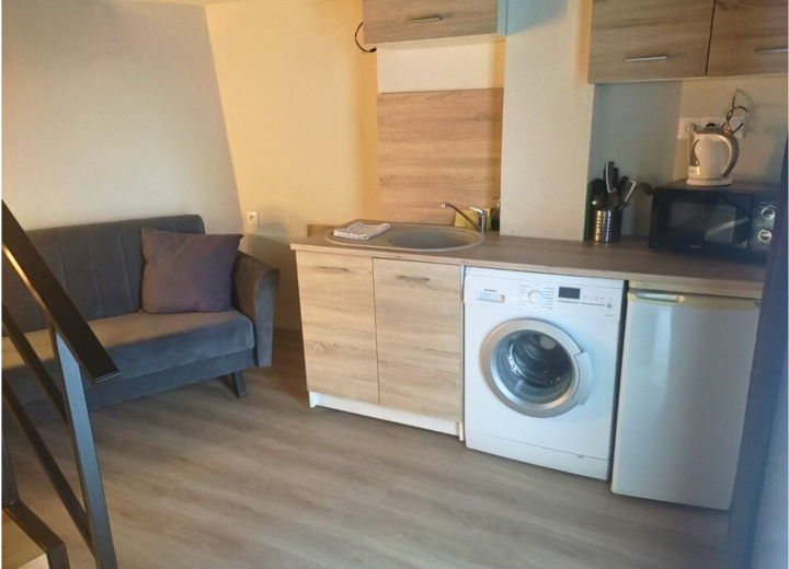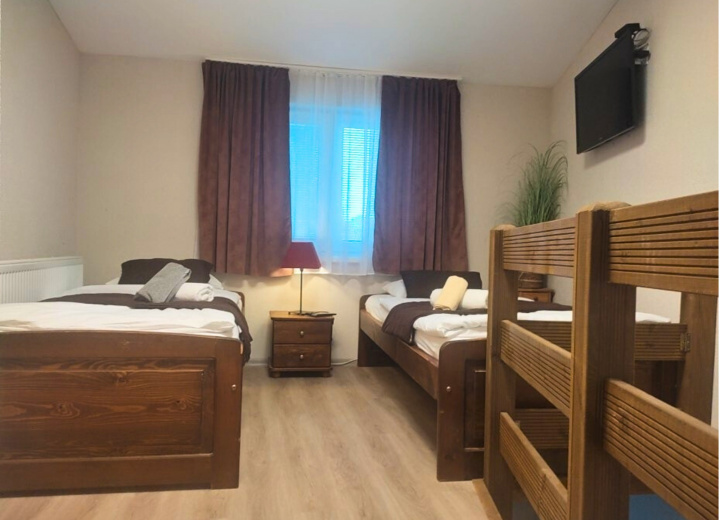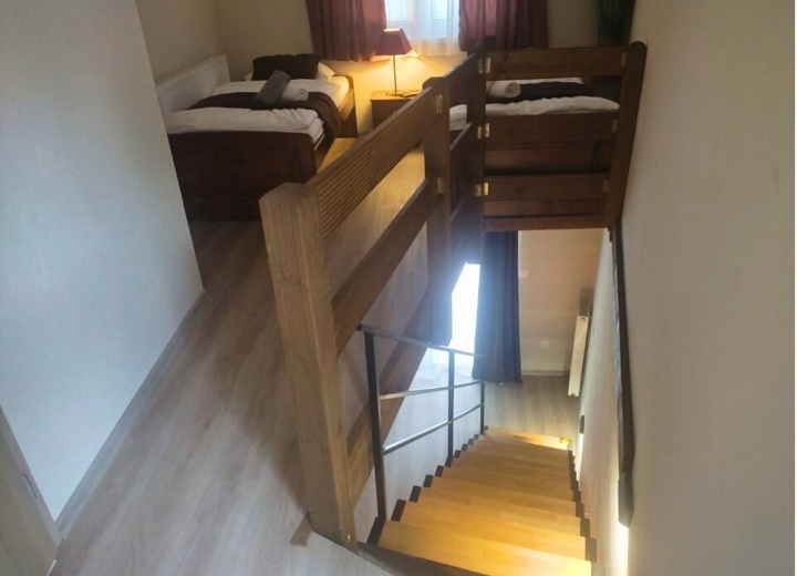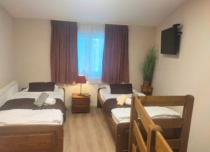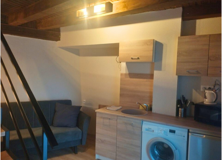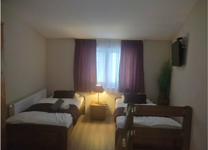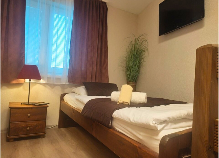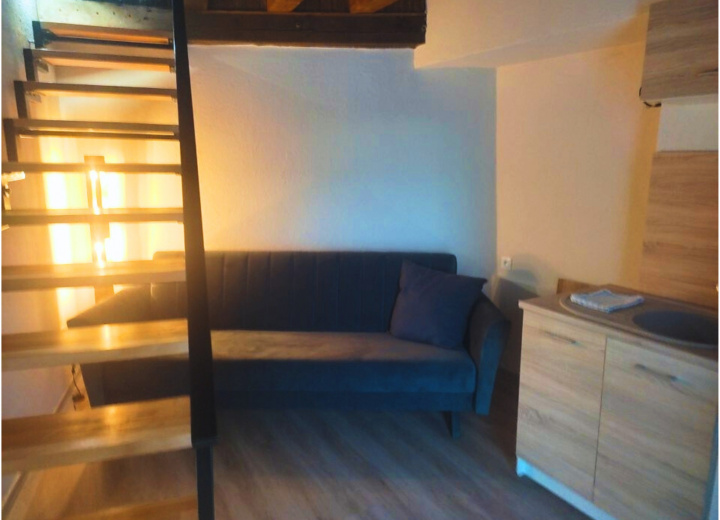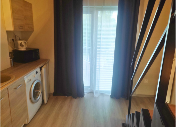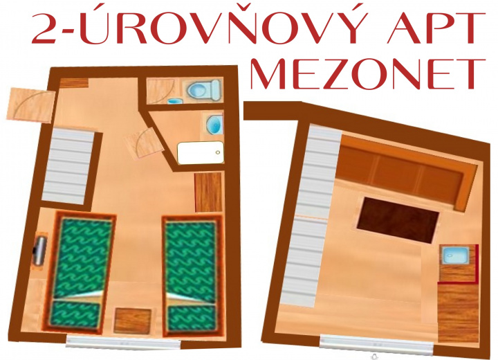 Útulný podkrovný mezonetový štúdio-apartmán na III. podlaží objektu s privátnou terasou, pohodlnými dvoma jedno-lôžkami na vrchnom a 1x rozkladacia SOFA (click-clack) s čajovou kuchynkou na dolnom poschodí, kúpeľňou s vaničkou / kútom a WC.