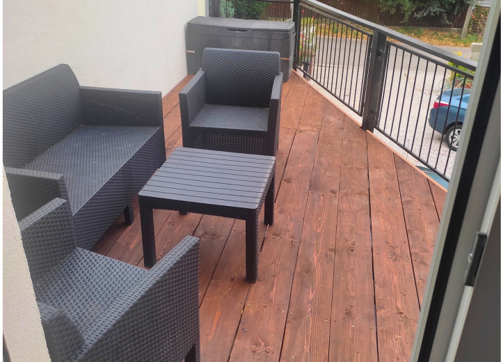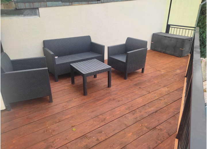 - Veľkorysá privátna terasa so sedením a veľkým slnečníkom