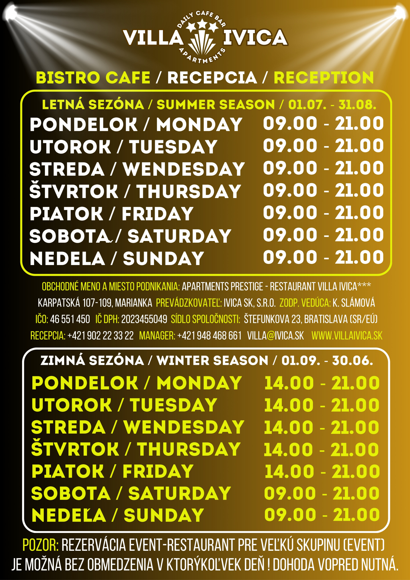 Prevádzkovateľ: IVICA SK, s.r.o., vedúca prevádzky a konateľ: K. Slámová