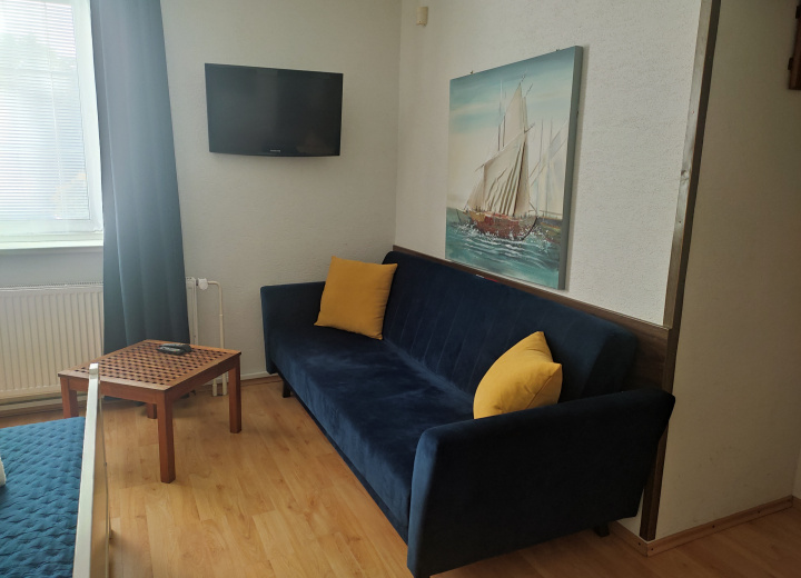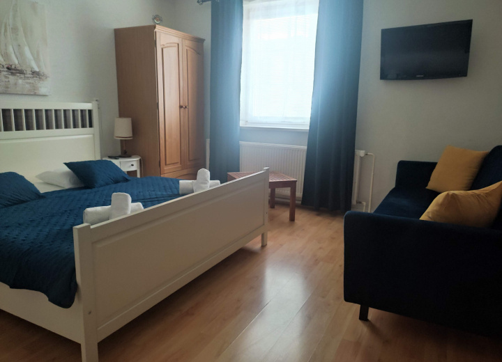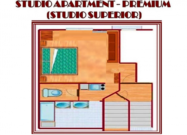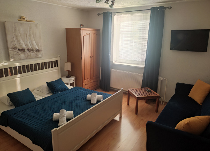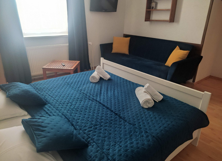 Dizajnový štúdio-apartmán na II. podlaží objektu, bez balkónu, pohodlným manželským lôžkom a rozkladacou SOFA (click-clack), vybavený čajovou kuchynkou a veľkorysou samostatnou kúpeľňou s vaňou + samostatné WC.