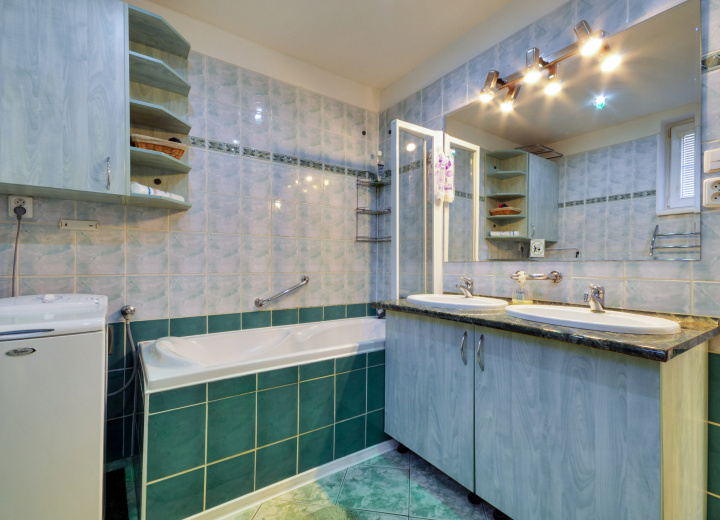 - Veľká kúpeľňa s dvoma umývadlami a plastovou vaňou