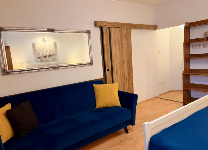 Dizajnový štúdio-apartmán na II. podlaží objektu, bez balkónu, pohodlným manželským lôžkom a rozkladacou SOFA (click-clack), vybavený čajovou kuchynkou a veľkorysou samostatnou kúpeľňou s vaňou + samostatné WC.