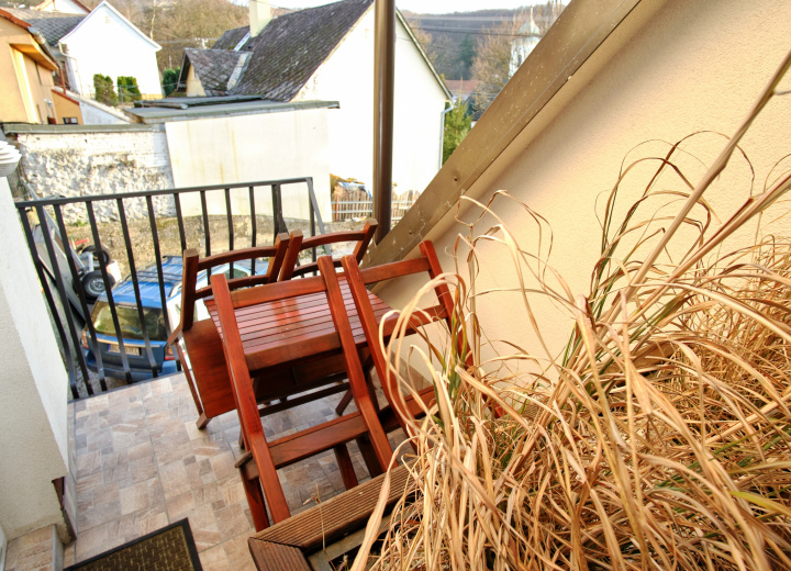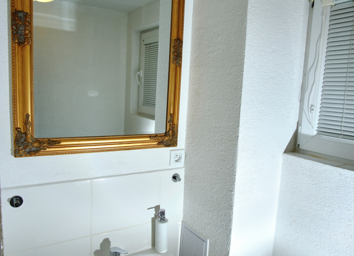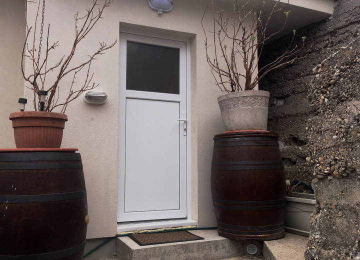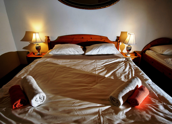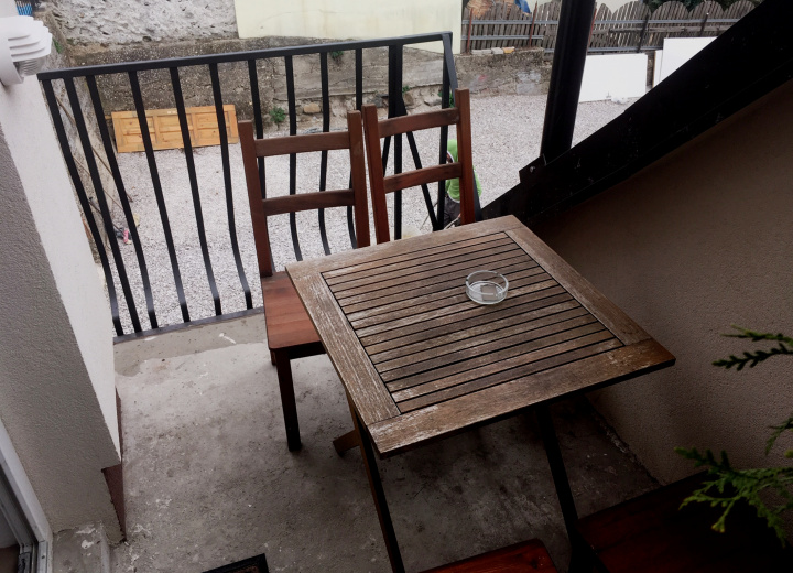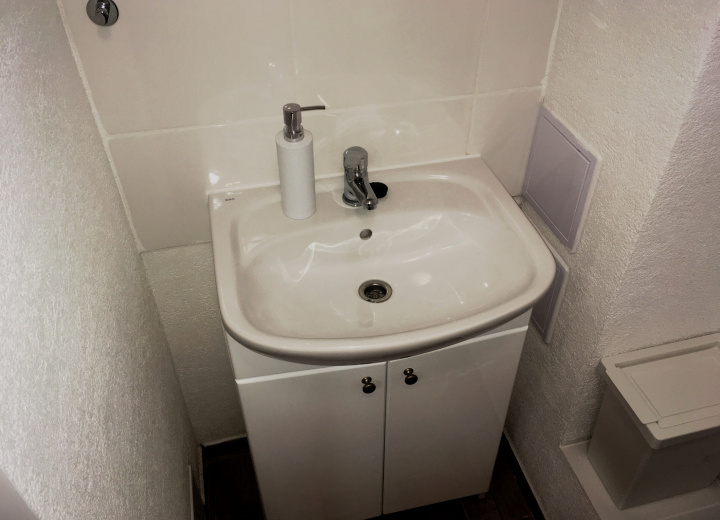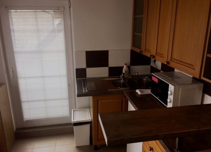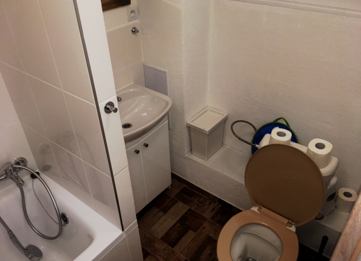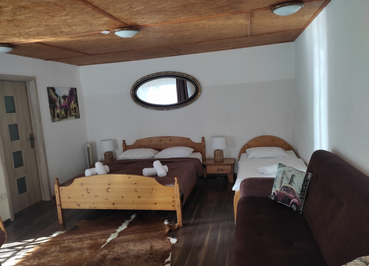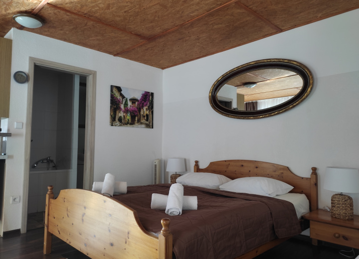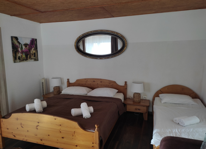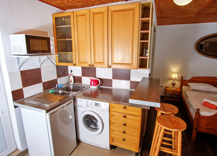 Dizajnovo zaujímavý a pohodlný štúdio-apartmán na II. podlaží objektu s privátnou terasou, pohodlným manželským lôžkom a jedno-lôžkom + rozkladacia SOFA (click-clack), vybavený čajovou kuchynkou a samostatnou kúpeľňou s vaničkou / kútom a WC.