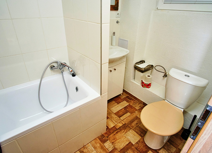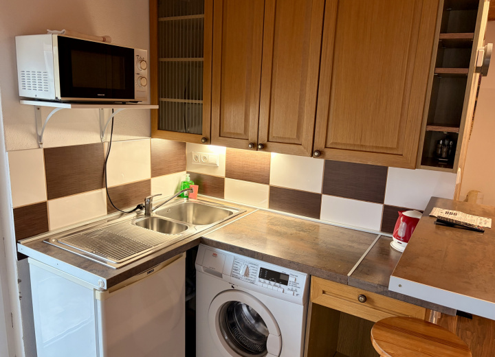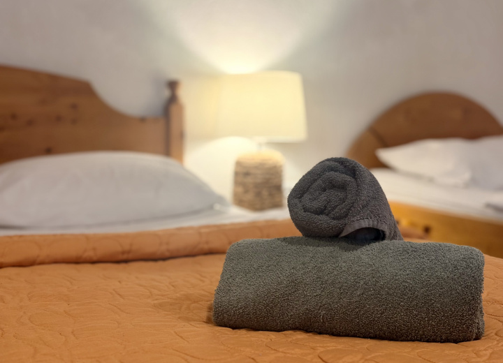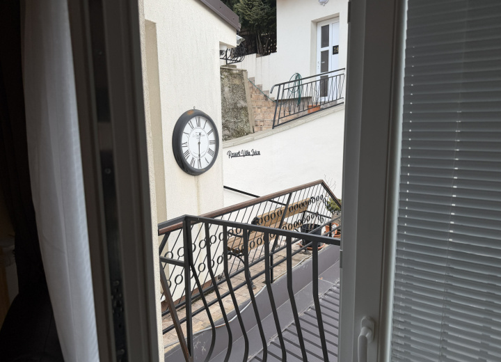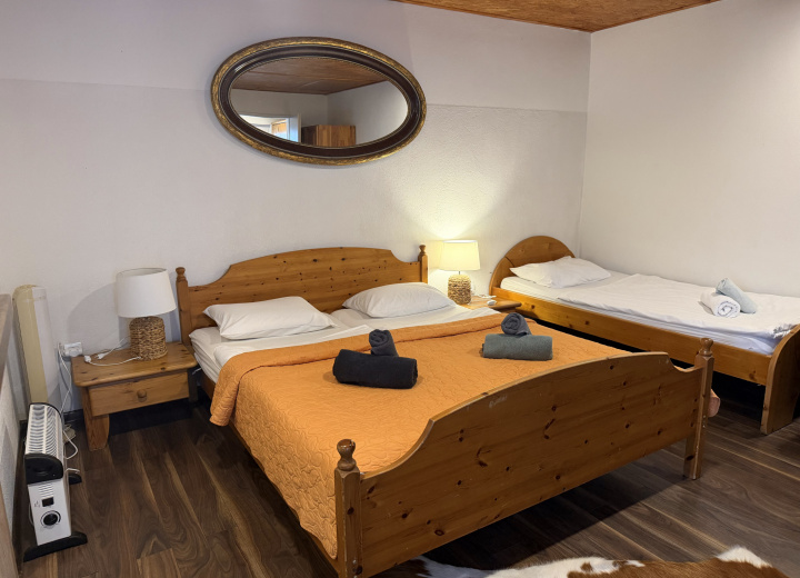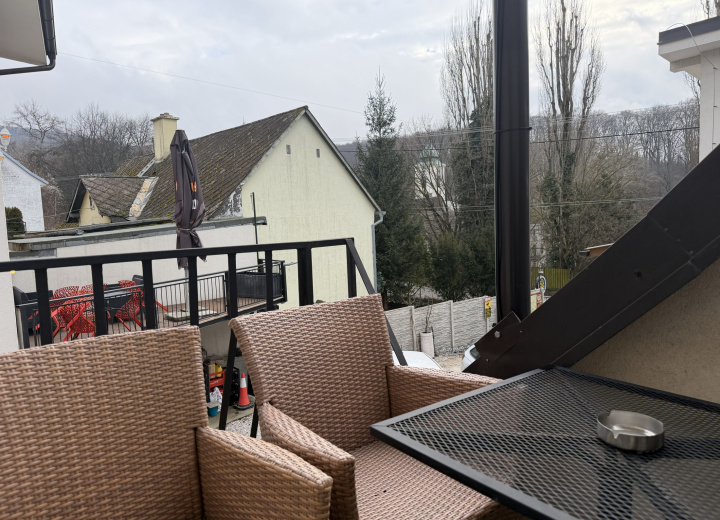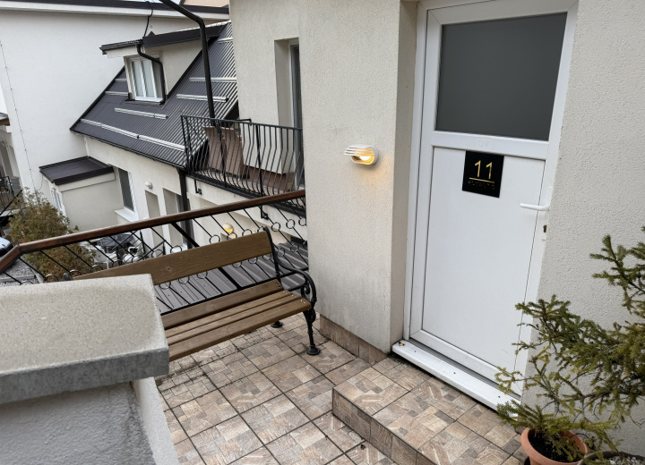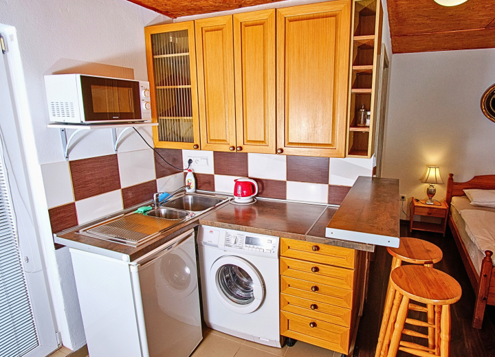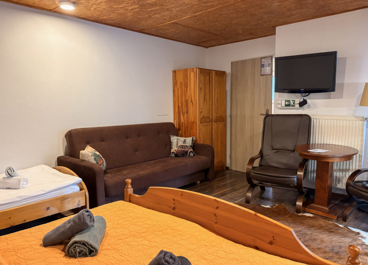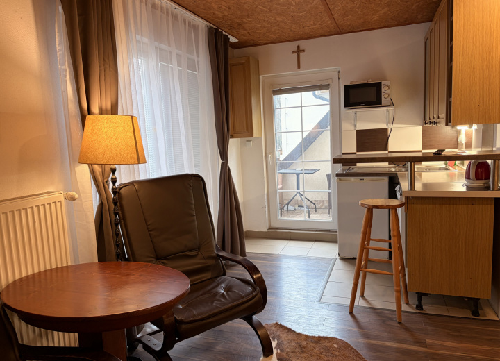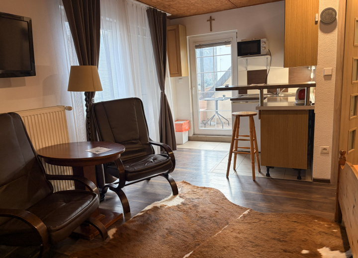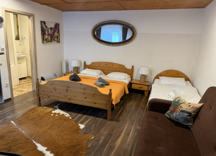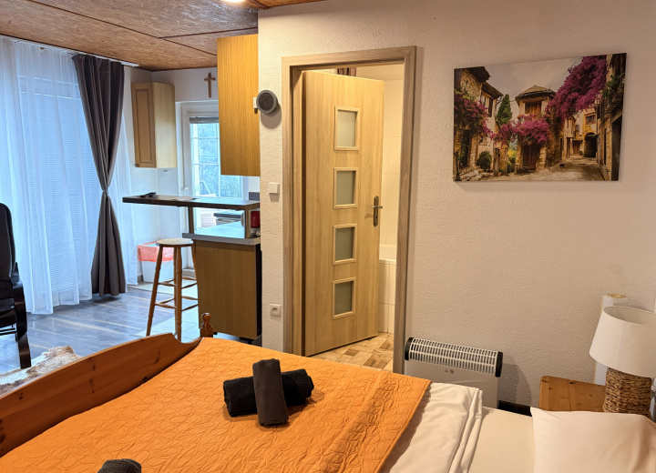 Dizajnovo zaujímavý a pohodlný štúdio-apartmán na II. podlaží objektu s privátnou terasou, pohodlným manželským lôžkom a jedno-lôžkom + rozkladacia SOFA (click-clack), vybavený čajovou kuchynkou a samostatnou kúpeľňou s vaničkou / kútom a WC.