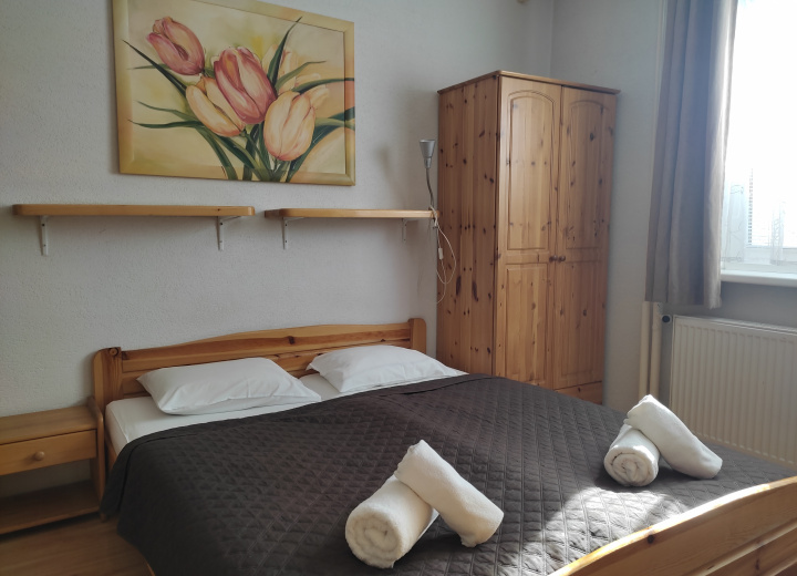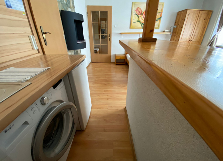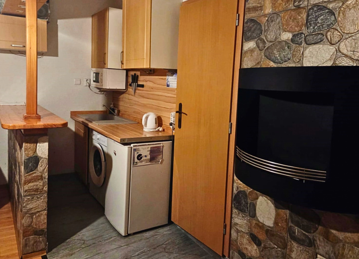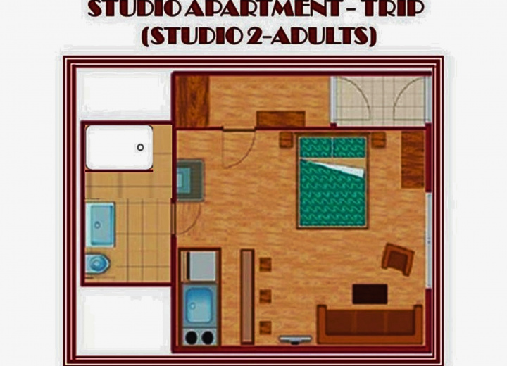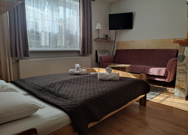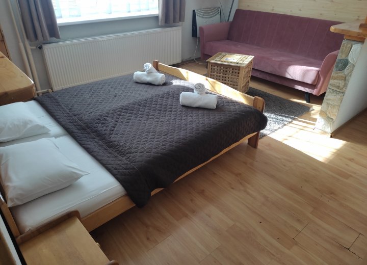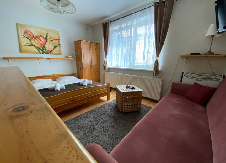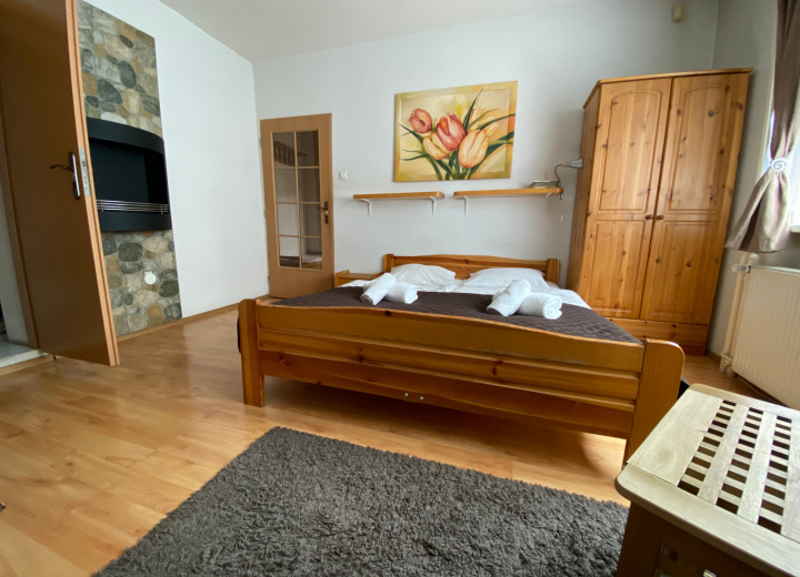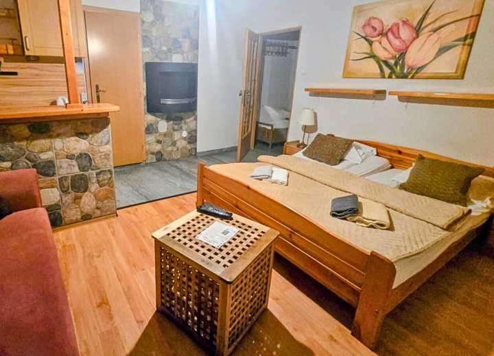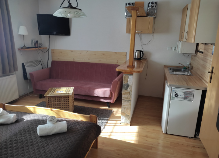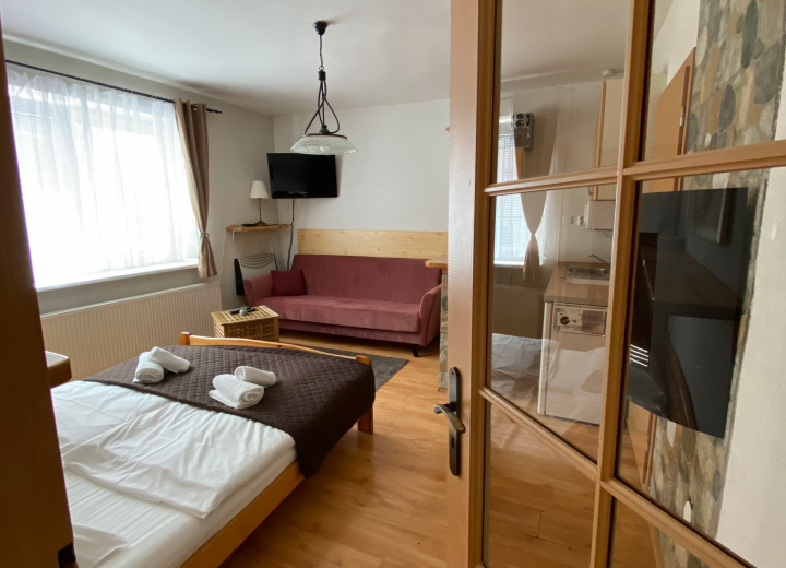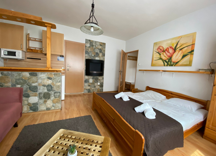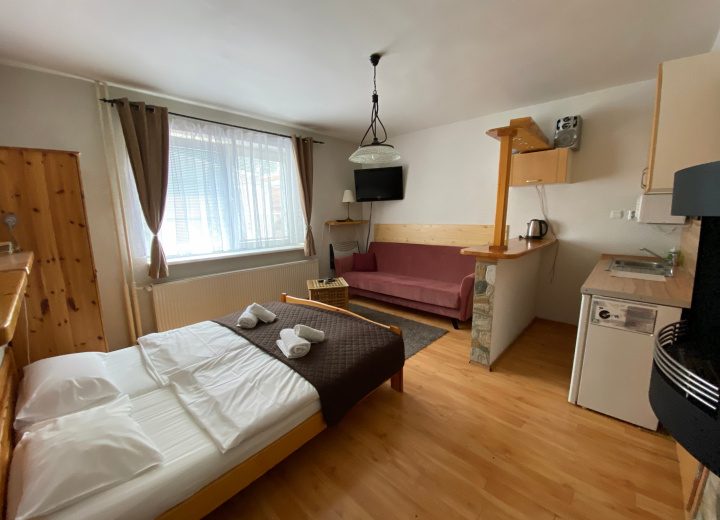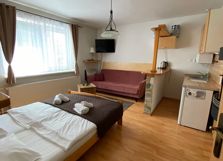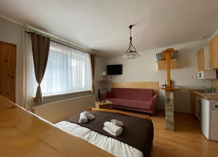 Štýlový štúdio-apartmán na prízemí objektu, s vlastným vchodom, pohodlným manželským lôžkom a rozkladacou SOFA (click-clack), vybavený čajovou kuchynkou a samostatnou kúpeľňou. Štúdio má privátnu krytú terasu.